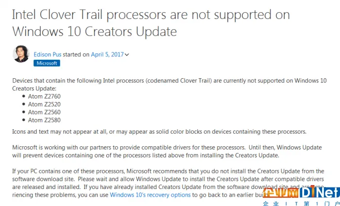 Windows 10创意者更新已经发布,目前的升级方式包括使用Windows 10易升、官方临时链接和MSDNITELLYOU的直链。不过,微软已经给出警告,Intel Clover Trail家族的处理器暂时不支持Windows 10创意者更新,万勿升级,涉及的型号有:Atom Z2760、Atom Z2520、Atom Z2560、Atom Z2580。