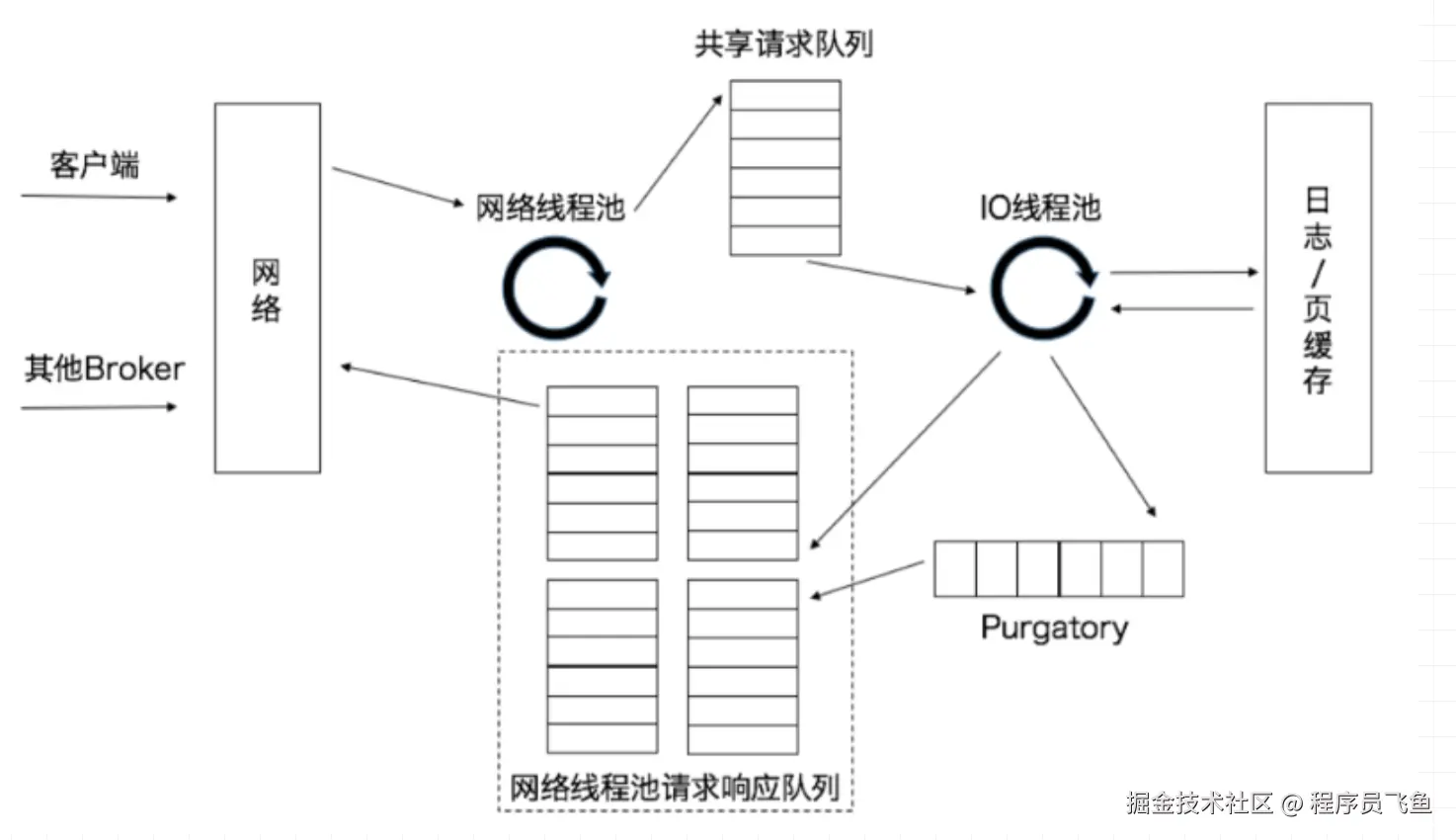 请求到Broker后,也会通过类似于请求转发的组件Acceptor转发到对应的工作线程上,Kafka中被称为网络线程池,一般默认每个Broker上为3个工作线程,可以通过参数 num.network.threads 进行配置。