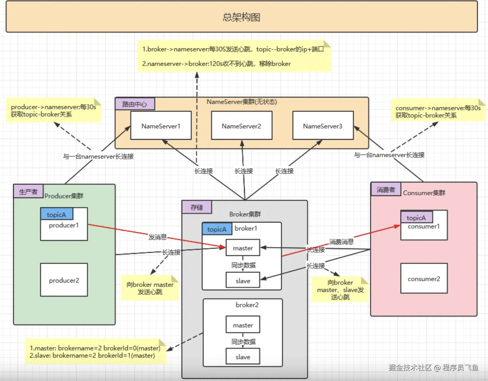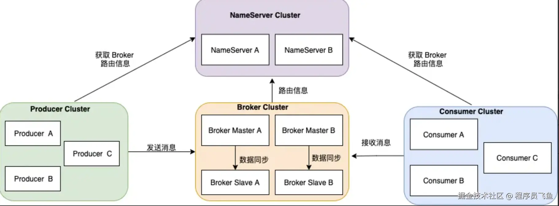 Nameserver集群,Topic的路由注册中心,为客户端根据Topic提供路由服务,从而引导客户端向Broker发送消息。