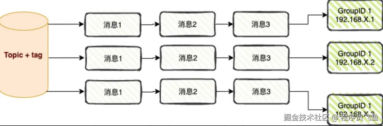 - 消息被负载均衡到了同一个消费组的多个消费者实例上。