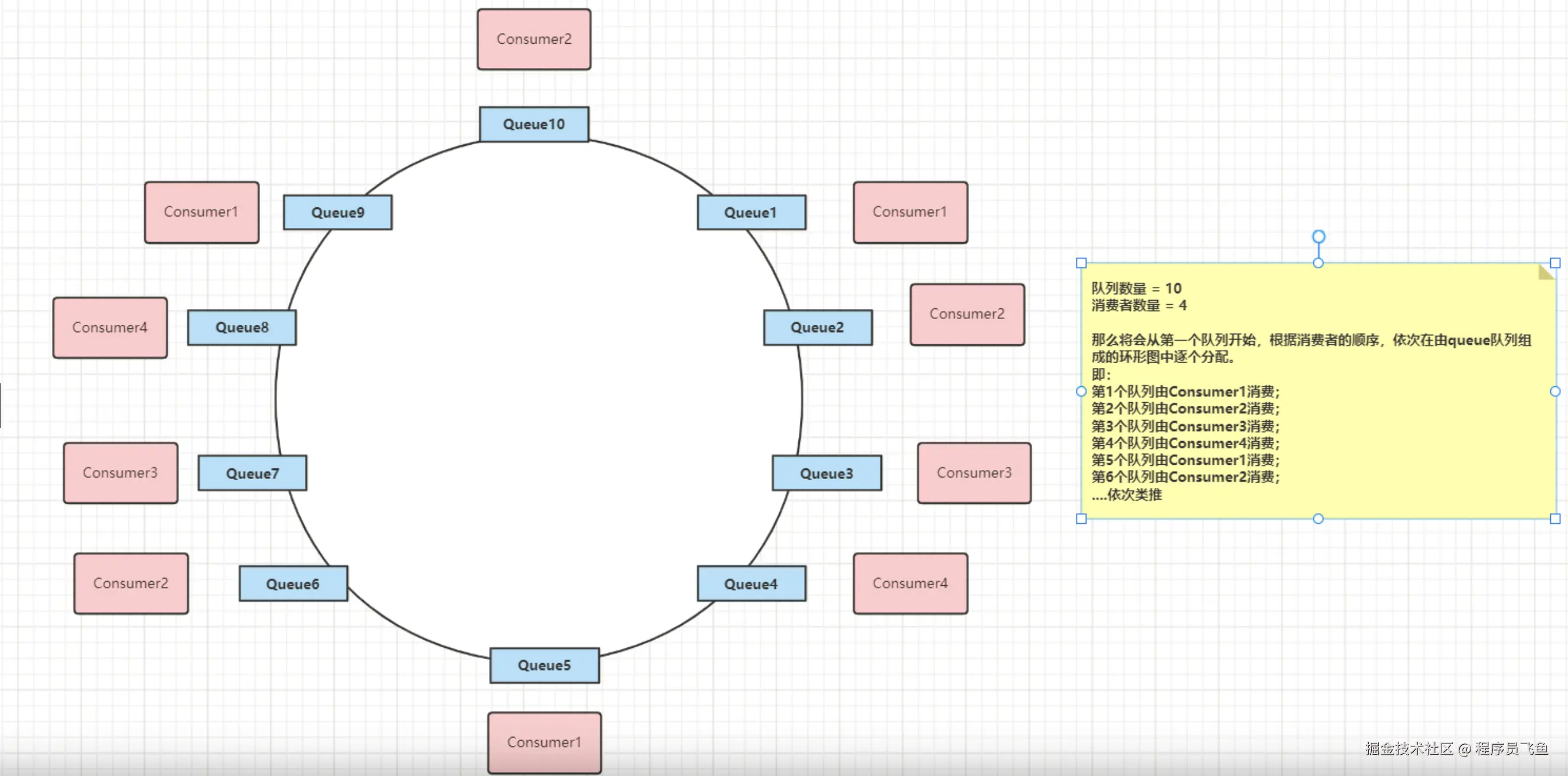 环形平均算法是指,根据消费者的顺序,依次由Queue队列组成的环形图逐个分配,该方法不需要提前计算。