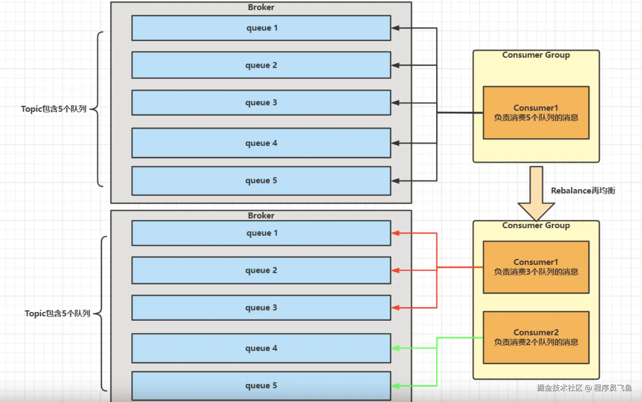 - 例如⼀个Topic下5个队列,有2个消费者的情况下,那么就可以给其中⼀个消费者分配2个队列,给另⼀个分配3个队列。