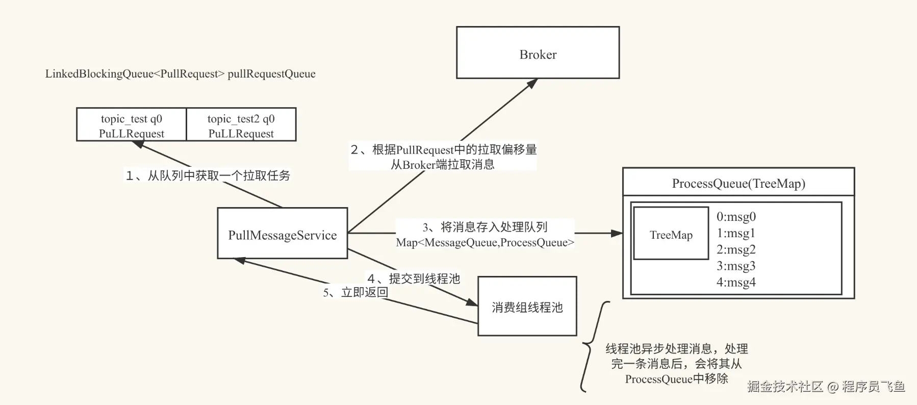 PUSH 模式拉取消息依赖死循环来不停唤起业务,而 PULL 模式拉取消息是通过 MessageQueue 监听器来触发消息拉取线程,消息拉取线程会在拉取完一次后接着下一次拉取。