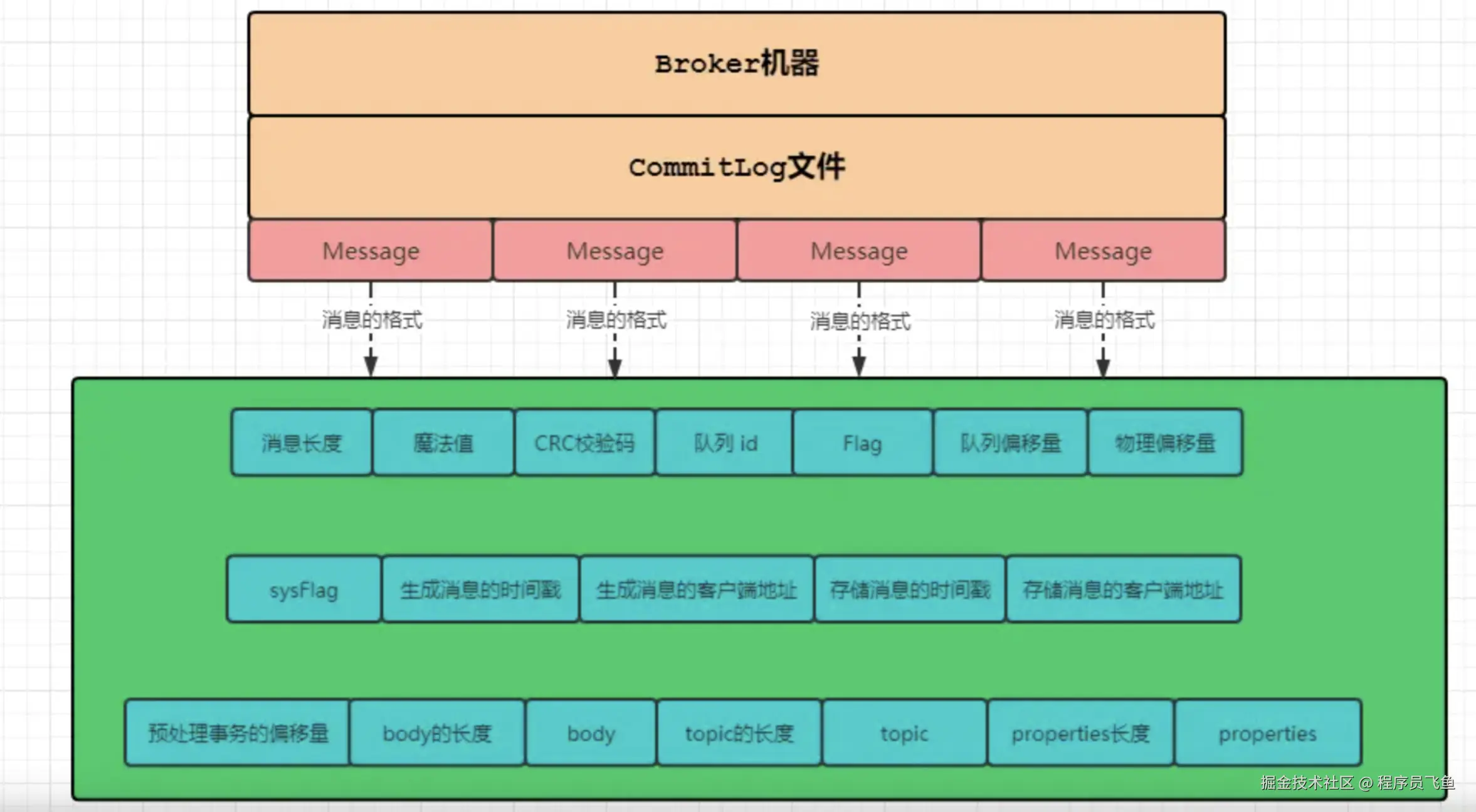 Broker服务器只有一个CommitLog文件(组),RocketMQ会将所有主题的消息存储在同一个文件中,这个文件中就存储着一条条Message,每条Message都会按照顺序写入。