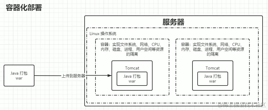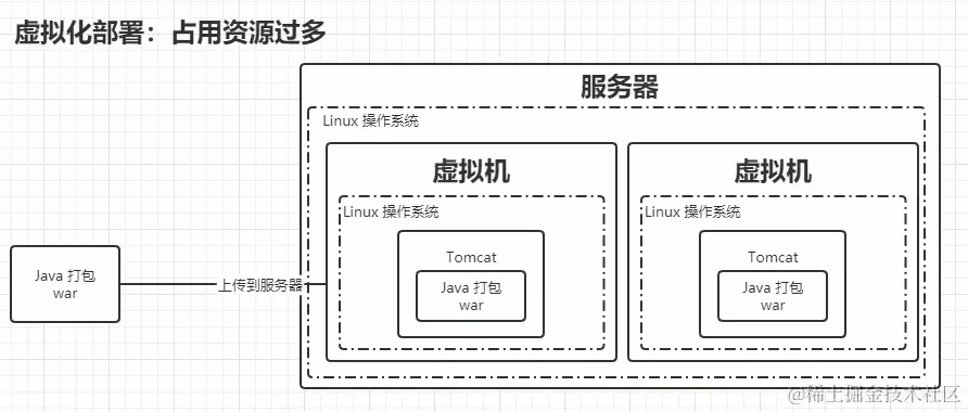 在虚拟机出现之前,应用往往直接部署在物理机器上。Java Web程序被打包成WAR(Web Application Archive)文件,手动将应用程序和其依赖项复制到目标服务器(例如Tomcat),并进行配置和启动