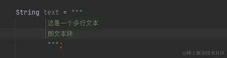 自 jdk15 以及之后,引入了文本块,这是一种定义多行字符串的解决方案,在 python 中也有文本块,用法都是以 """ 开头或者结尾即可,这样的方式简化了多行字符串的实现方式,对于 sql,json,html 提高了可读性,具体的使用如下所示: