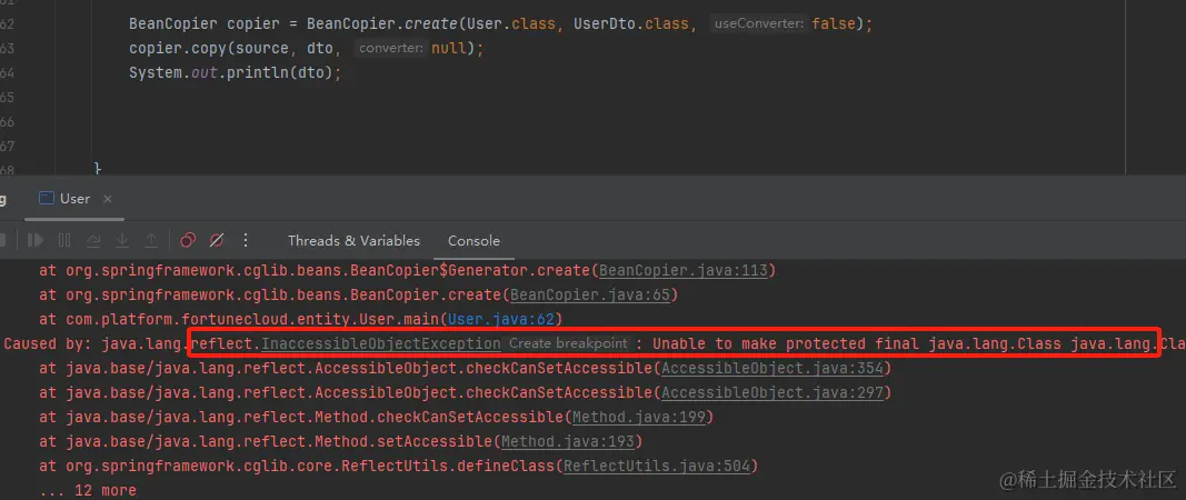 jdk17 中使用 BeanCopier 进行对象 copy 时,会报如下错误,目前在项目中添加参数不能解决这个问题,在复制对象时,可以使用 json 序列化与反序列化的方式或者使用 BeanUtils (apache spring工具类均可)来解决。