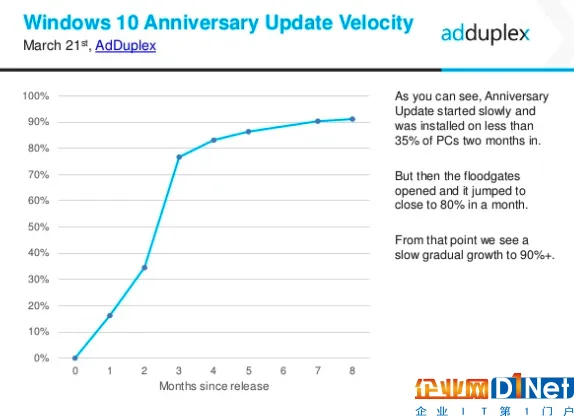 发布 8 个月后,周年更新(v1607+)已占据八成以上的 Windows 10 PC 。