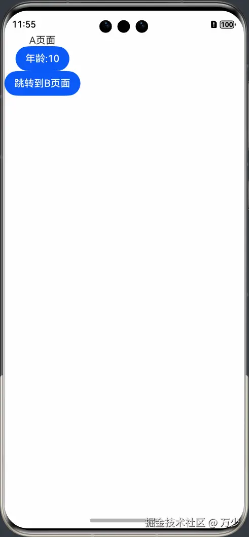 import { AppStorageV2, router } from '@kit.ArkUI' @ObservedV2 export class Person { @Trace age: number = 10 } @Entry @ComponentV2 struct Index { @Local person: Person = AppStorageV2.connect(Person, () => new Person)! build() { Column() { Text("A页面") // 预览器会失效 Button(`年龄:${this.person.age}`) .onClick(() => { this.person.age++ }) Button("跳转到B页面") .onClick(() => { router.pushUrl({ url: "pages/Index2" }) }) } } }