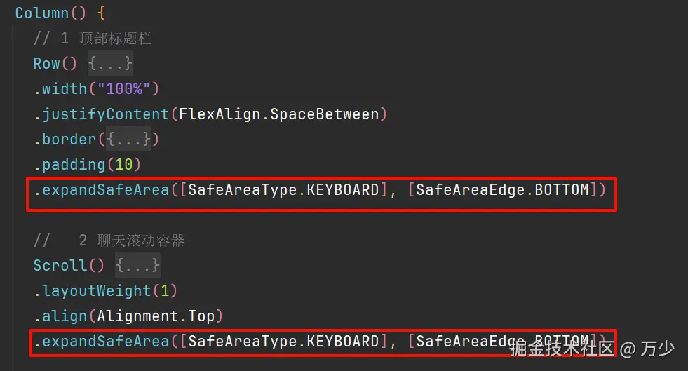 // 2 聊天滚动容器 Scroll() { Column({ space: 10 }) { ForEach(this.chatList, (item: ChatMessage, index: number) => { if (item.type === MessageType.text) { this.chatTextBuilder(item.content, item.time) } }) }.width("100%") .padding(10) .justifyContent(FlexAlign.Start) } .layoutWeight(1) .align(Alignment.Top) .expandSafeArea([SafeAreaType.KEYBOARD], [SafeAreaEdge.BOTTOM])