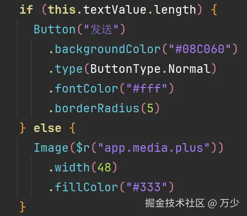 Button("发送") .backgroundColor("#08C060") .type(ButtonType.Normal) .fontColor("#fff") .borderRadius(5) .onClick(this.sendTextMessage)