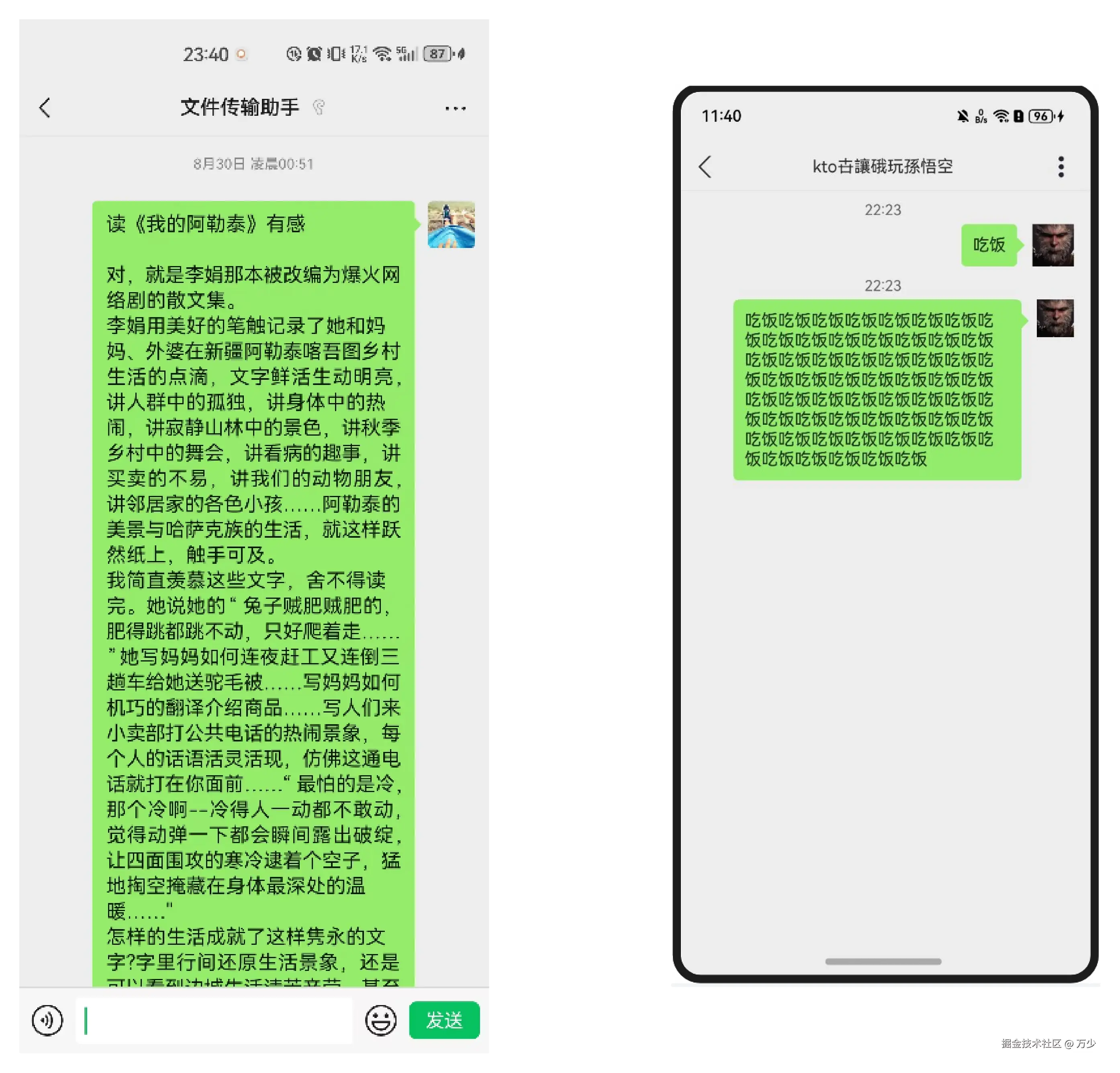 - 当文字较多时,绿色聊天框宽度自动变宽,但是不会铺满一行,微信也是这样设计的