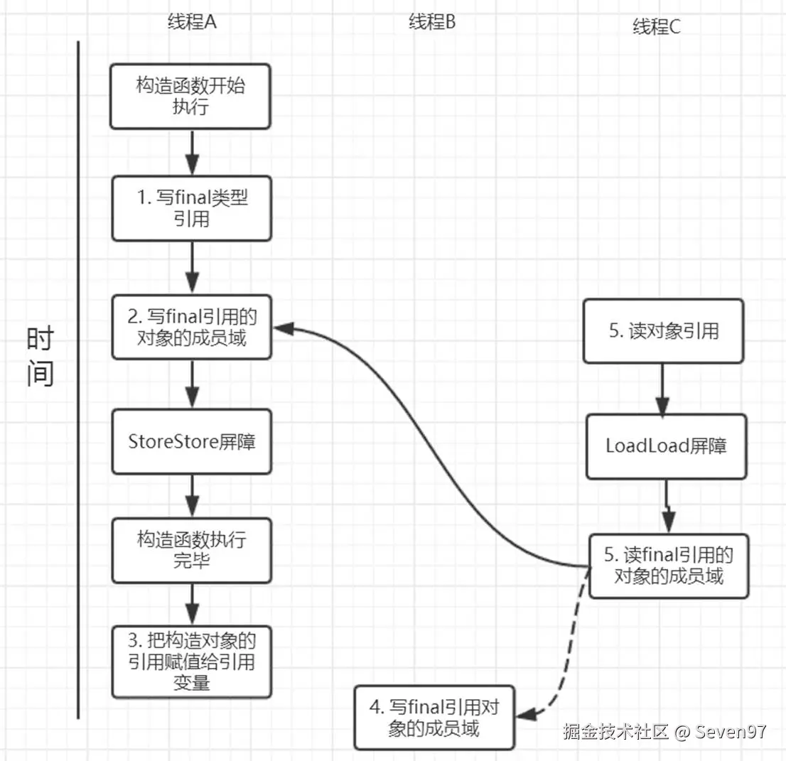 - final域写:禁止final域写与构造方法重排序,即禁止final域写重排序到构造方法之外,从而保证该对象对所有线程可见时,该对象的final域全部已经初始化过。