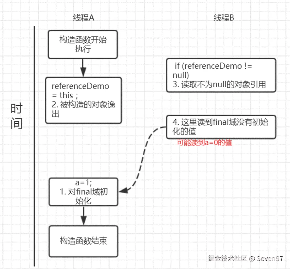 由于a,b之间没有数据依赖性,普通域(普通变量)a可能会被重排序到构造函数之外,线程B就有可能读到的是普通变量a初始化之前的值(零值),这样就可能出现错误。而final域变量b,根据重排序规则,会禁止final修饰的变量b重排序到构造函数之外,从而b能够正确赋值,线程B就能够读到final变量初始化后的值。