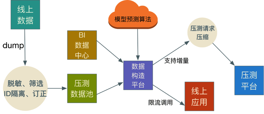 以上两个关键点必须同时做到,否则全链路压测结果的误差会比较大,参考的价值将会大打折扣。我们为此专门搭建了全链路压测的数据构造平台,构建业务模型,同时完成海量业务数据的自动化准备。