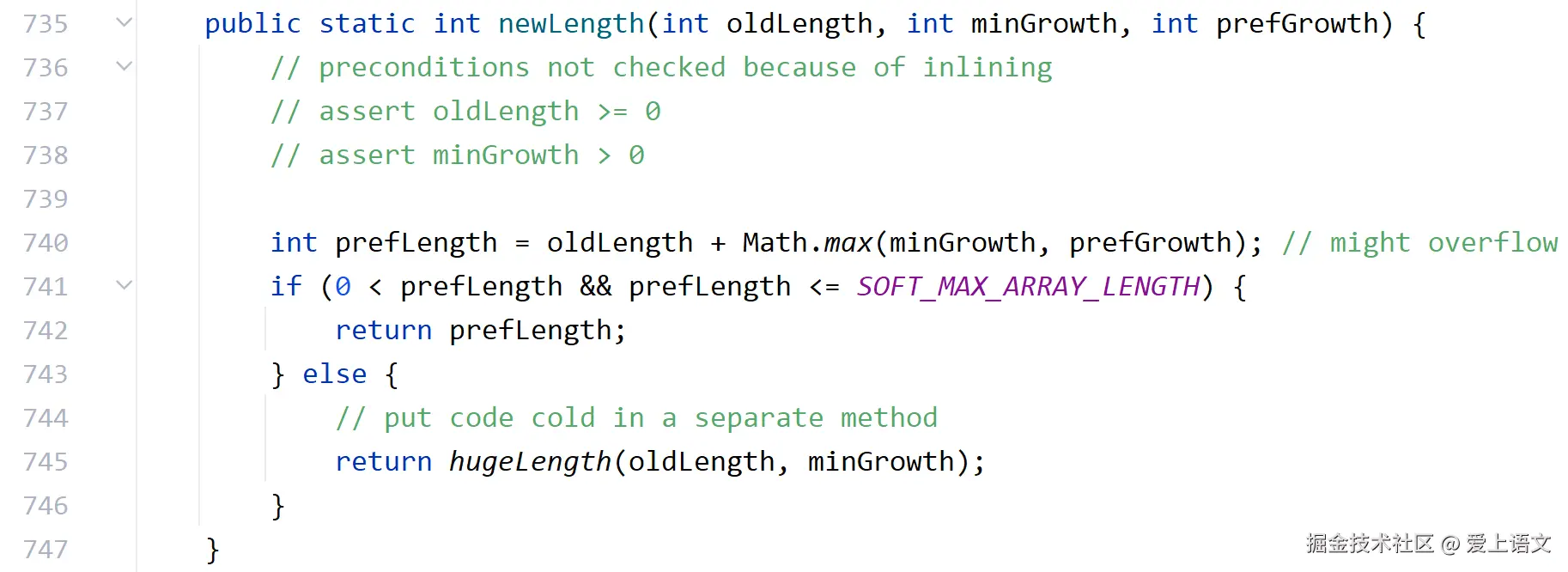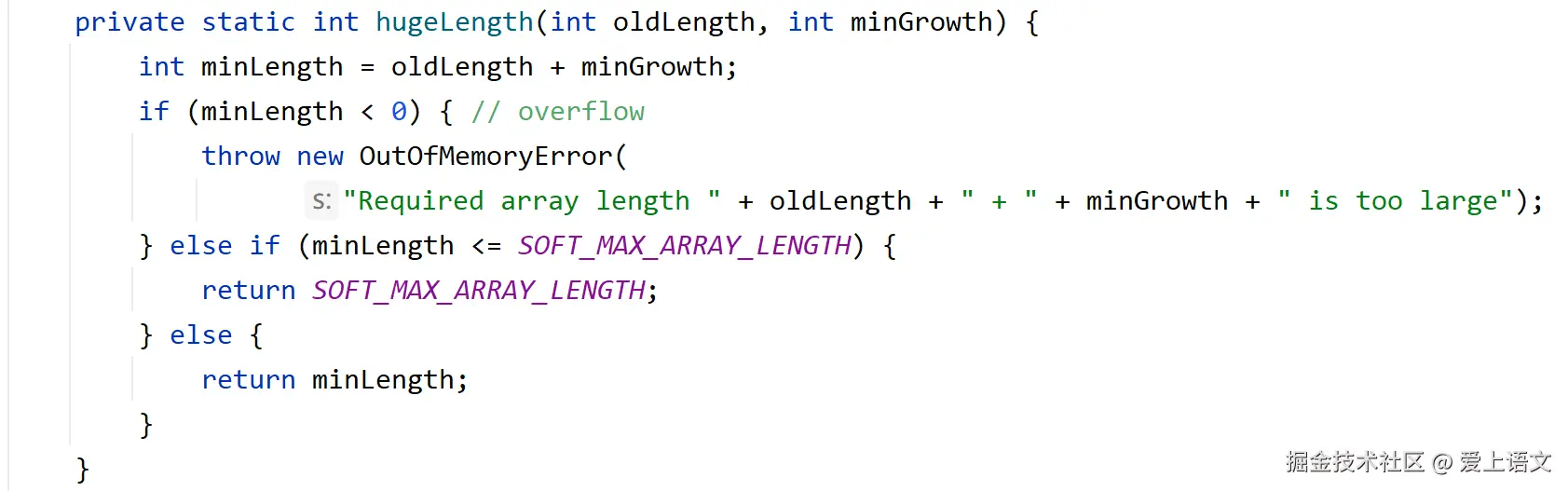 还有一个用于处理数组长度可能溢出的方法hugeLength(oldLength, minGrowth),当prefLenght的大小大于了SOFT_MAX_ARRAY_LENGTH这个常量(Integer的最大值-8)就会进入else,也就是进入了hugeLength(oldLength, minGrowth)方法(但是基本上不可能真用到这个方法吧?):