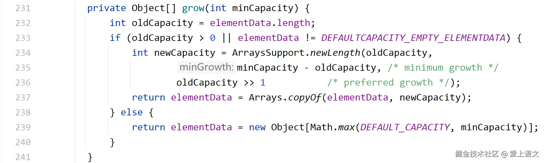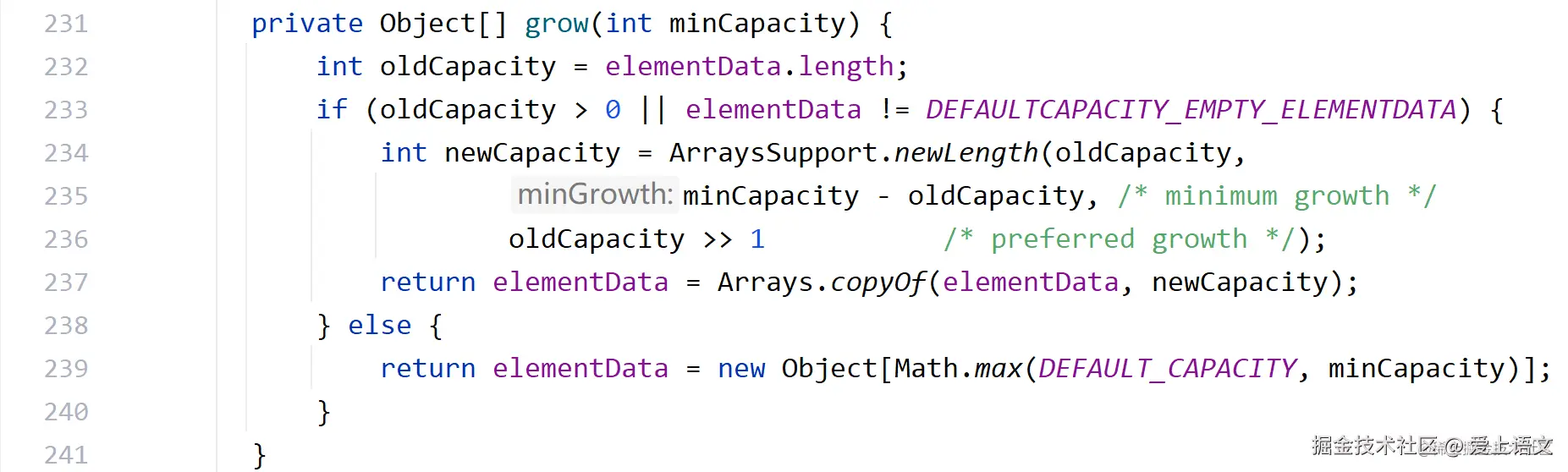 重载的grow方法得到的minCapactiy是11,oldCapacity是10,然后开始判断if——显然oldCapacity是大于0的(这次的elementData也不是空数组,但是因为是||所以说直接就进入if了)。if里面会调用一个newLength方法给数组扩容(实际上是创建了一个新数组并且将原来的元素拷贝过去)里面的参数分别是oldCapacity(老容量);minGrowth(需要扩容的最小容量)——这个参数是数组扩容后的最小容量减去老容量;和oldCapacity>>1(将老容量右移1位)相当于将老容量/2。本次的参数分别是oldCapacity:10;minGrowth:11-10=11;;oldGrowth>>1:5,然后进入newLength的源码分析: