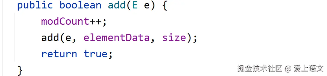 调用ArrayList中的add方法,传入想要加入集合的元素,然后接收到返回值(但ArrayList返回值没什么意义),元素就成功加入集合了。但数组的长度发生了什么变化?还是进入源码: