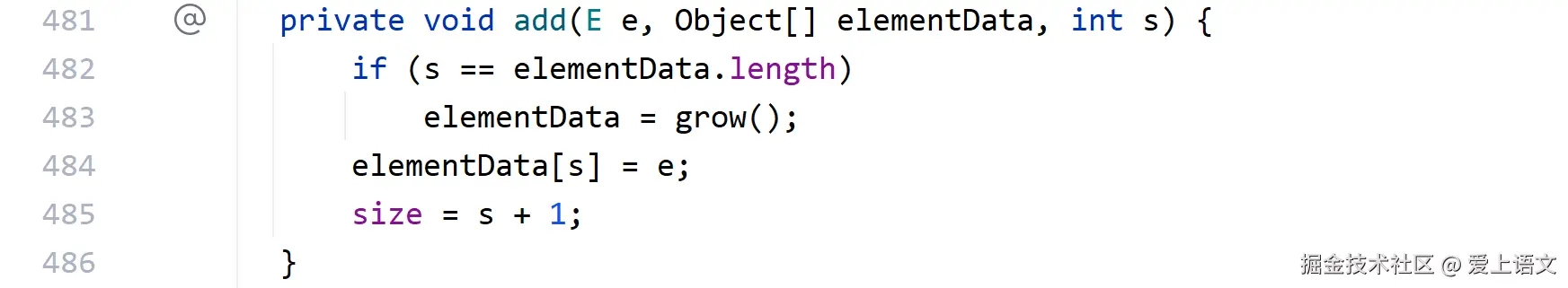 首先modCount这个变量会自增一次(这个变量是用来记录集合的操作次数的,对于扩容原理用处不大。)然后调用add的重载方法,这个方法需要三个参数——第1个参数是需要加入集合的元素,第2个参数是底层的element数组,第3个参数是size,size十分重要,代表了元素应该加入的索引和现在的集合大小(扩容的判断条件),然后就返回true了(可以看到add方法总是返回true,这也间接证明了add的返回值没有意义),现在进入add重载方法的源码: