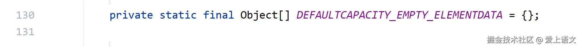 可以看到当我们创建一个ArrayList对象的时候,它会在底层创建一个名叫elementData的数组,并把DEFAULTCAPACITY_EMPTY_ELEMENTDATA这个用final修饰的空数组赋值给它——可见最开始创建ArrayList的时候是在底层创建了一个空数组的;源码可见,DEFAULTCAPACITY_EMPTY_ELEMENTDATA是一个空数组: