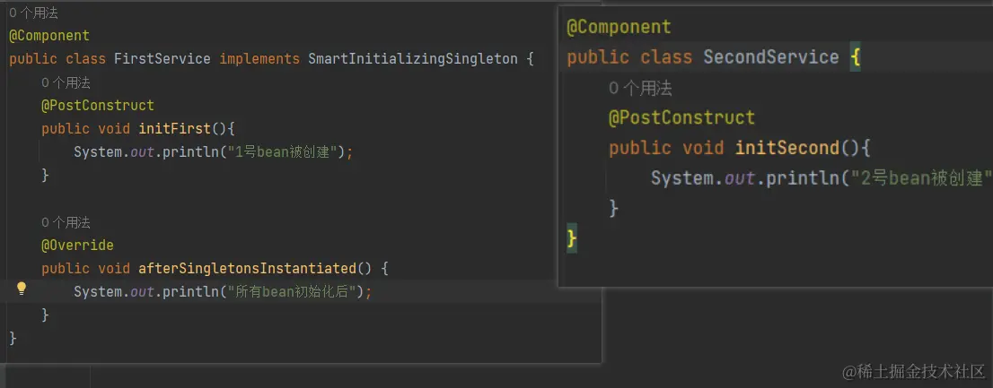 还是不行,@PostConstruct 的东西还是先创建了,不过起码保证了 FirstService 的 afterSingletonsInstantiated 方法是所有单例 Bean 初始化之后执行的。