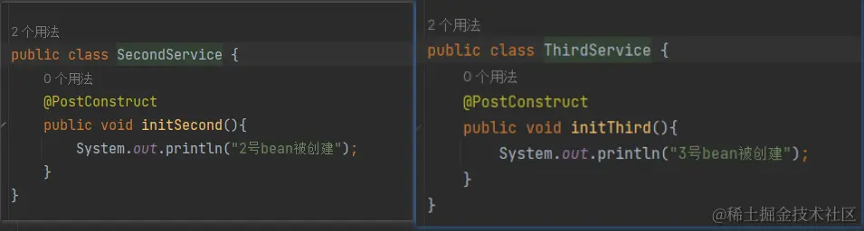 目前一共有两个 service ,每个 service 都有一个 init 方法,打印bean创建时机,正常状态打印结果如下: