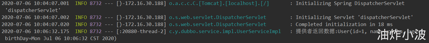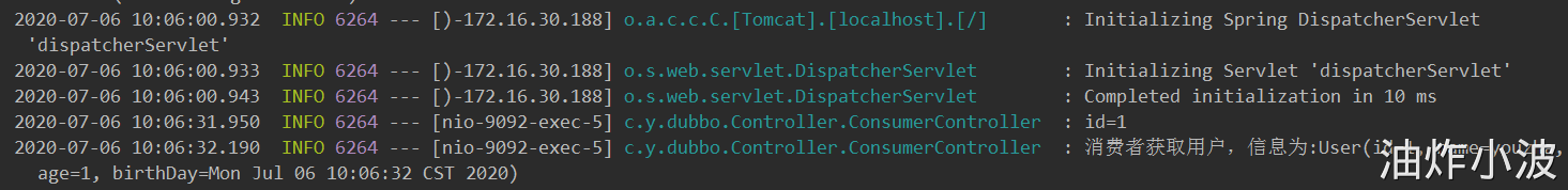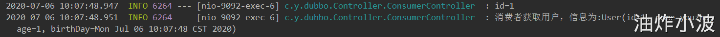 此时直接通过自身IP访问消费者,地址:http://localhost:9092/consumer/getUserById?id=1,查看日志: