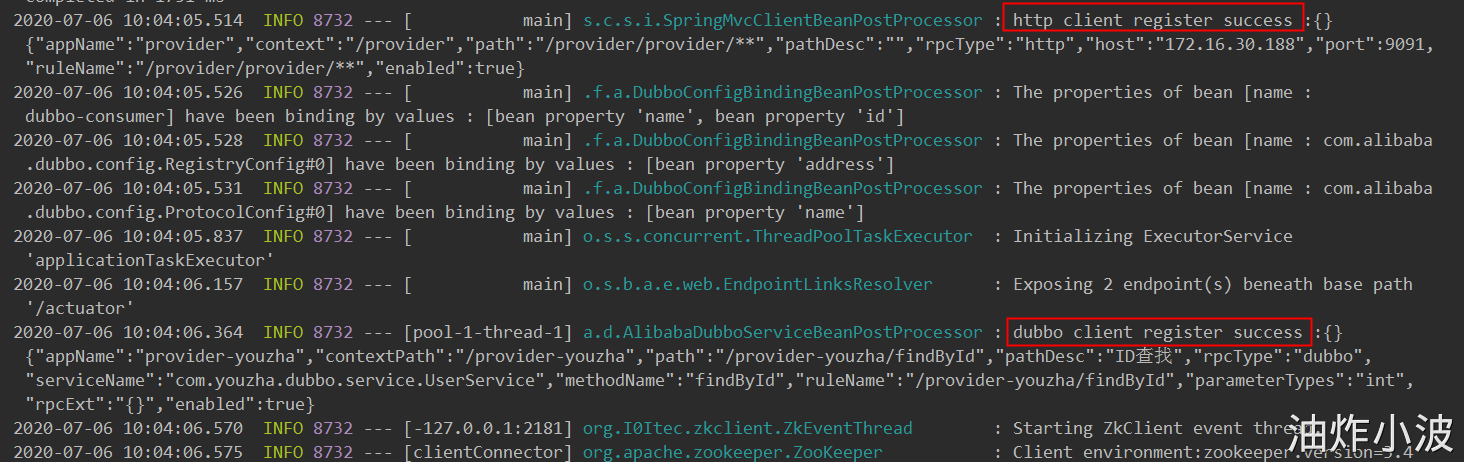 直接启动相关Application即可,出现下面的日志则表示注册成功: