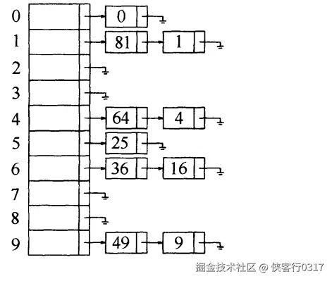 使用分离链表法的哈希表: