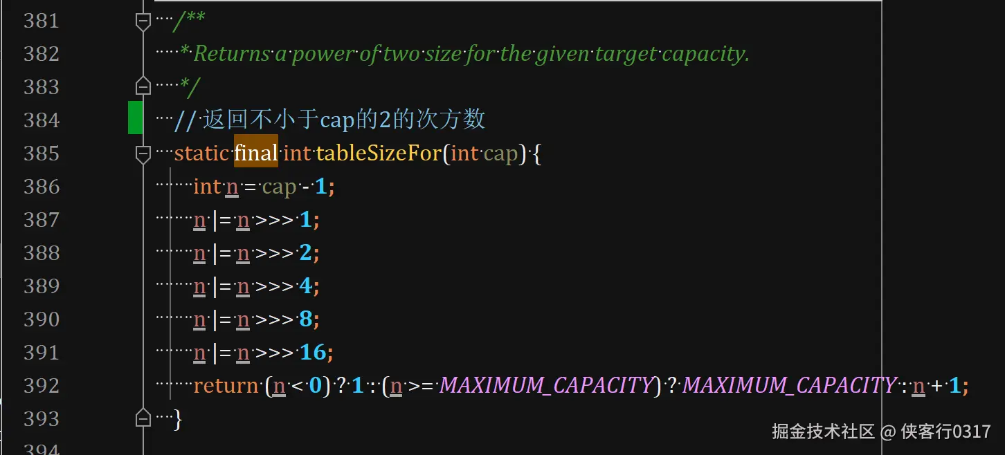 当指定initialCapacity时,会通过计算得到tableSize。HashMap中哈希表长度,要求始终是2的次方数。便于使用&与运算计算余数。