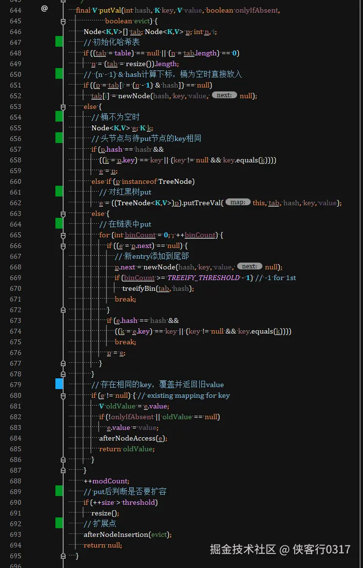 先看hashCode计算,HashMap中做了优化。 核心逻辑在putVal()中,逻辑如下: