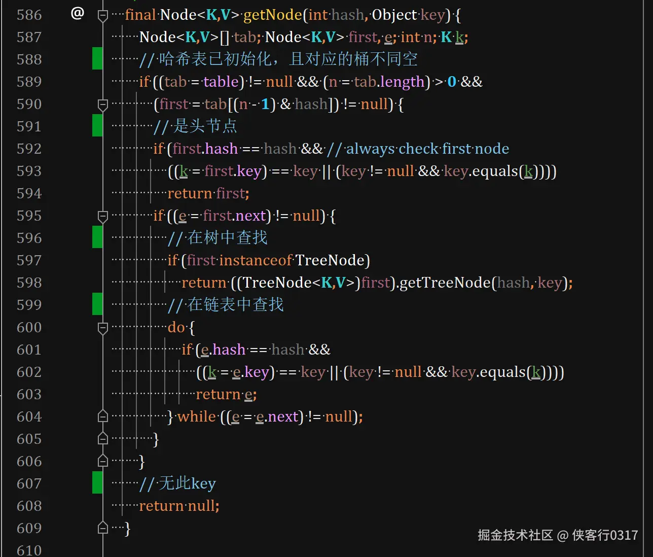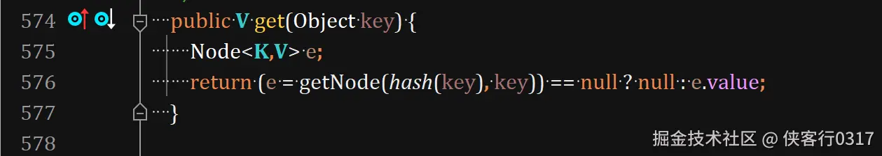 get方法调用了getNode(),在key不存在时返回null。