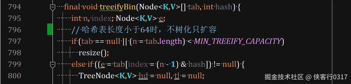 - 在JDK8中,除了容量达到阈值外,当哈希表长度小于64时,某个桶中的链表长度大于等于7时,也会触发扩容。(树化只是提高了桶中查询效率,而扩容直接削弱了哈希冲突程度,效果更好)