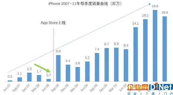 这是乔布斯时代iphone的季度销量数据。除去5年60倍的销量增长之外,我们需要注意的是07年12月到08年7月间iphone连续两个季度的销量下滑。这说明iphone颠覆式的触屏体验,并未能转化为持续性的产品竞争力。直到08年7月,App Store上线,将应用服务与终端体验完美结合,立即激发了当季销量的激增,并真正开启了iphone的持续辉煌轨迹。