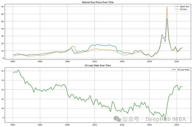本节通过分析亚洲和欧洲天然气价格与美国商业银行个人贷款利率之间的关系进行实证研究。基于经济学理论,我们预期两个天然气价格指数之间存在较强的相关性。而日本液化天然气价格与美国贷款利率之间理论上缺乏直接的因果联系(虽然可能通过宏观经济指标间接关联,但这种关联在实务中并不构成显著的因果关系)。