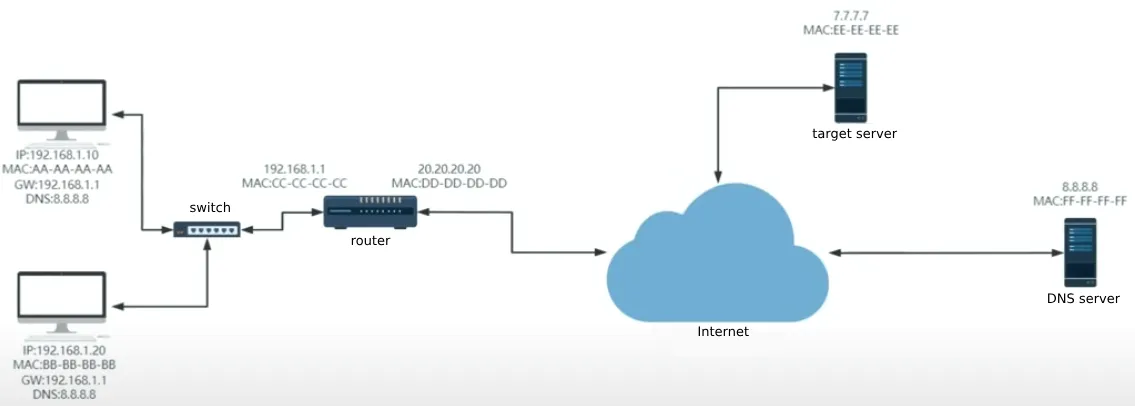 192.168.1.10and the destination ip is the DNS server's ip8.8.8.8. But the DNS ip you cannot find locally, so you need to send the DNS request to the gateway you connect. And because the communication via MAC address in the same network, so it will be processed in data link layer. - In data link layer, the source MAC address