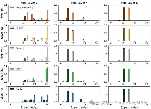 MOE 机制为 MOIRAI 带来了显著提升。那么,各个专家究竟学习到了什么? 它们如何协同处理不同频率的数据?