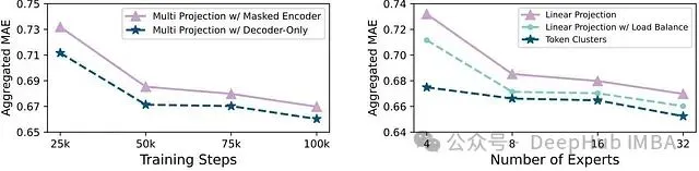 研究发现,聚类中心能够有效捕获结构化数据模式,从而提升路由准确性和整体性能。此外图 6** 也验证了纯解码器架构相比 MOIRAI 原始编码器架构的优势。