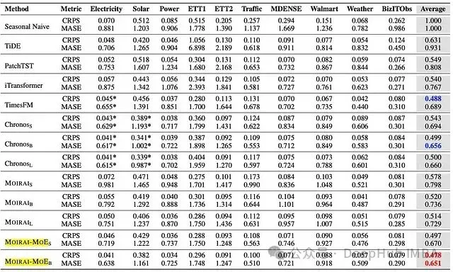 图 9:*MOIRAI-MOE 与其他基础模型及深度学习模型在分布外零样本预测的对比。 最优结果以红色突出显示,次优结果以蓝色标示。*平均列经过 Seasonal Naive 归一化。