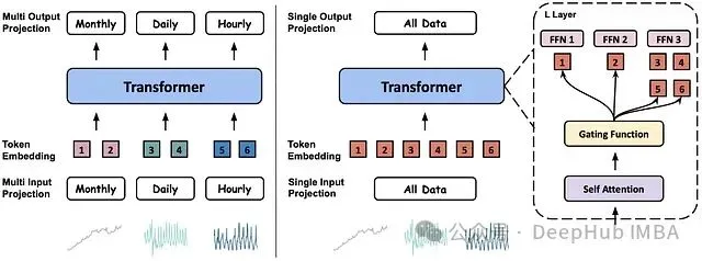 图 6:*MOIRAI 与 MOIRAI-MOE 的架构细节对比*