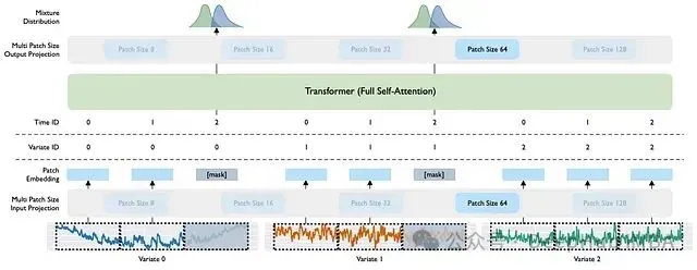 图 4:*MOIRAI 的架构示意图,采用 64 大小的 patch 处理小时或分钟级数据。*