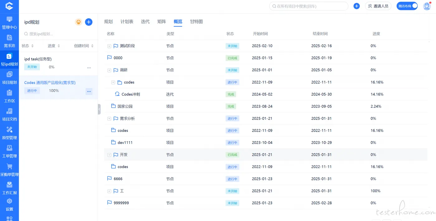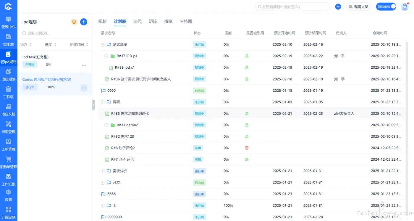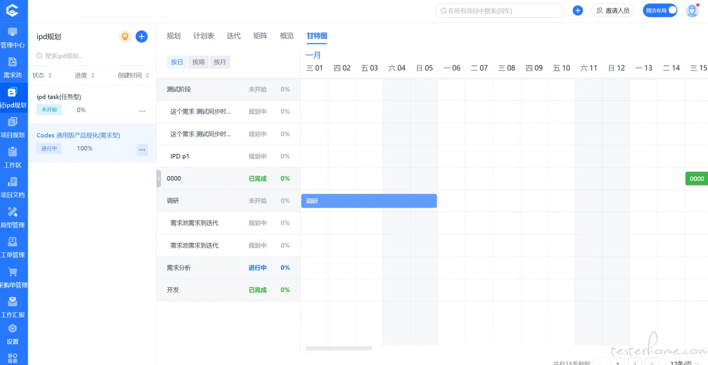 采用轻量化的 IPD 模式实现,且融合了敏捷 。轻 IPD 主要解决多项目交付的研发过程管理,相比标准 IPD 的两个流程:作正确的事和正确的做事,轻 IPD 中只实现了正确的做事,评审也做了简化,只维护评审记录不进行再线评审。IPD 中有规划、计划表,迭代,矩阵、概览等功能