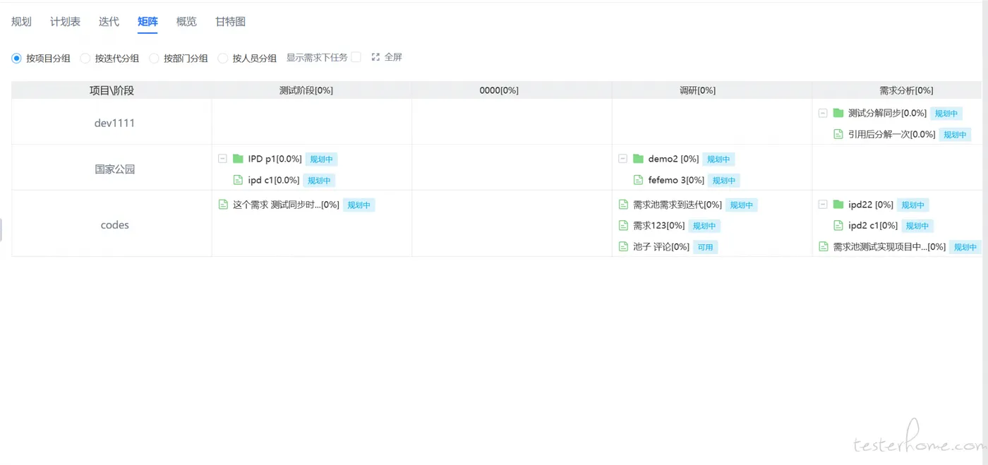 横向为阶段,纵向可以项目,可以是迭代,部门和人员,中间的方格中显示对应的需求,还可设置是否显示需求任务