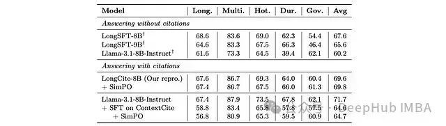 SimPO 微调过程对答案的正确性没有产生显著影响,答案正确性与未进行引用信息训练的基线模型基本持平,表明 SelfCite 在提升引用质量的同时,没有损害模型的原始问答能力。使用 ContextCite SFT 数据进行训练,答案正确性出现轻微下降,这可能是由于 SFT 阶段缺乏指令遵循数据所致。然而,后续的 SimPO 步骤在提升引用质量的同时,并未对答案正确性造成进一步的负面影响。
