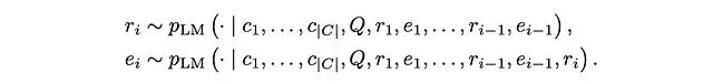 在 SelfCite 方法中,回复 R 中的每个陈述 ri 后都跟随一个引用序列 ei,该序列由上下文 C 中句子的标识符组成。因此完整的回复序列 R 形式化为 {r1,e1,r2,e2,…,rS,eS},其中 S 是生成的陈述总数。引用 ei 旨在指向支持陈述 ri 生成的上下文句子。形式上,对于每个回复陈述 ri,模型输出一个引用序列 ei = {e1i ,e2i ,…,emi },其中每个 eji ∈ {1,2,…,|C|} 对应于上下文 C 中的特定句子编号,共引用 m 个句子。值得注意的是,引用序列可以为空。由陈述 ri 及其后的引用 ei 组成的完整回复 R 从语言模型 pLM 中采样得到,过程如下: