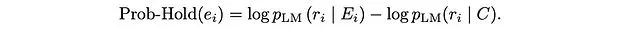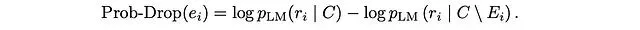 必要性得分 (Probability Drop):该指标量化了当所有被引用的句子 Ei 从上下文中移除时,生成陈述 ri 的概率降低程度。公式如下: