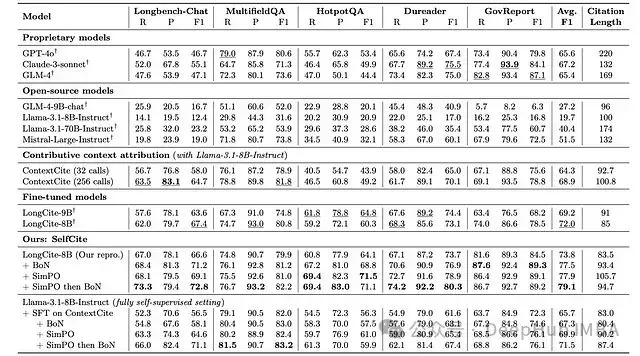 SelfCite 方法的性能结果与商业级的 Claude Citations API 接近,显示了 SelfCite 在实际应用中的潜力。实验结果还表明,即使从完全自监督的 SFT 模型出发,应用 SimPO 对齐方法也能够显著提升引用质量,这验证了在缺乏监督数据的情况下,该对齐方法的有效性。