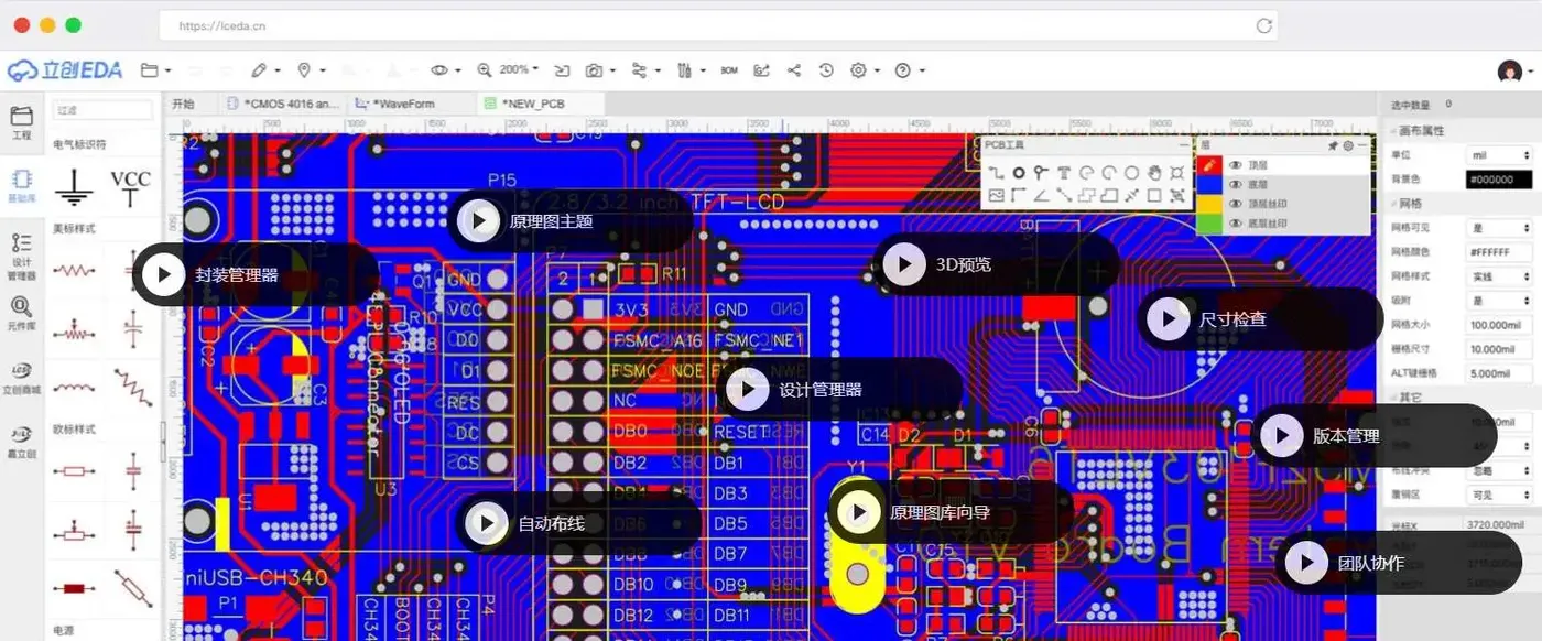 并且与立创商城打通,可以快速下单、打板。操作思路和方法与以上软件类似。绘制的原理图和PCB可以转换到以上软件中使用。