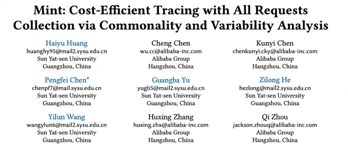 在入选顶会ASPLOS的论文《Mint: Cost-Efficient Tracing with All Requests Collection via Commonality and Variability Analysis》中,阿里云提出了一套全新链路追踪框架Mint,该框架通过“共性+差异”的新采样范式,既能保留重要信息,又能减少数据体量,实现了优化存储与网络开销的同时,捕获所有请求的调用链信息,让开发者可以借助丰富的数据更好的理解与管理复杂的应用系统。该论文是阿里云在可观测链路追踪(Tracing)领域入选的首篇顶会文章。