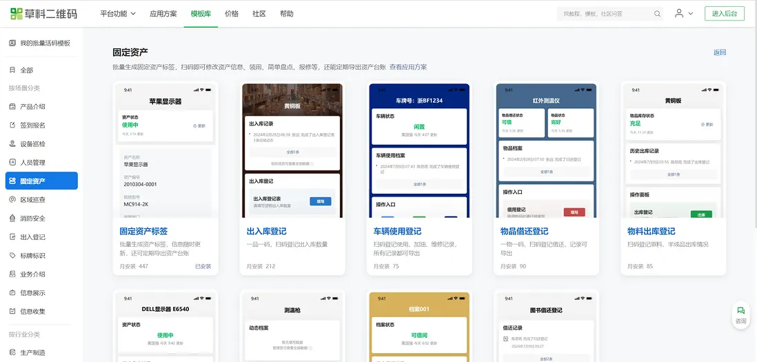 在电脑端进入草料二维码官网,点击【模板库】,选择【固定资产】分类,选择合适的固定资产模板,即可免费使用。